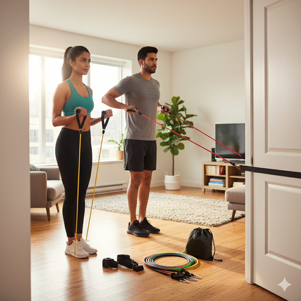 This complete set includes heavy resistance bands with comfortable handles, door anchors, ankle straps, and a carrying bag, providing everything you need for a full-body workout.